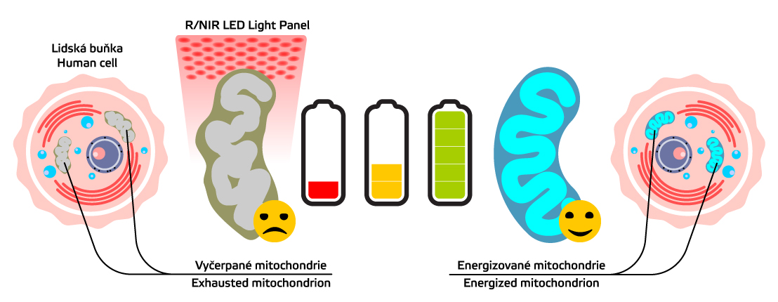 Ближнє інфрачервоне світло (NIR), своєю чергою, стимулює вироблення мітохондрій, збільшуючи виробництво клітинної енергії. Це відбувається тому, що мітохондрії в клітинах функціонують як батарейки — вони зберігають енергію для належного функціонування самої клітини. Білки в стінці мітохондрій реагують на інфрачервоне світло і змушують клітину виробляти більше енергії. Це дає клітинам достатньо «соку» для виконання своїх нормальних функцій, включаючи створення нових клітин.