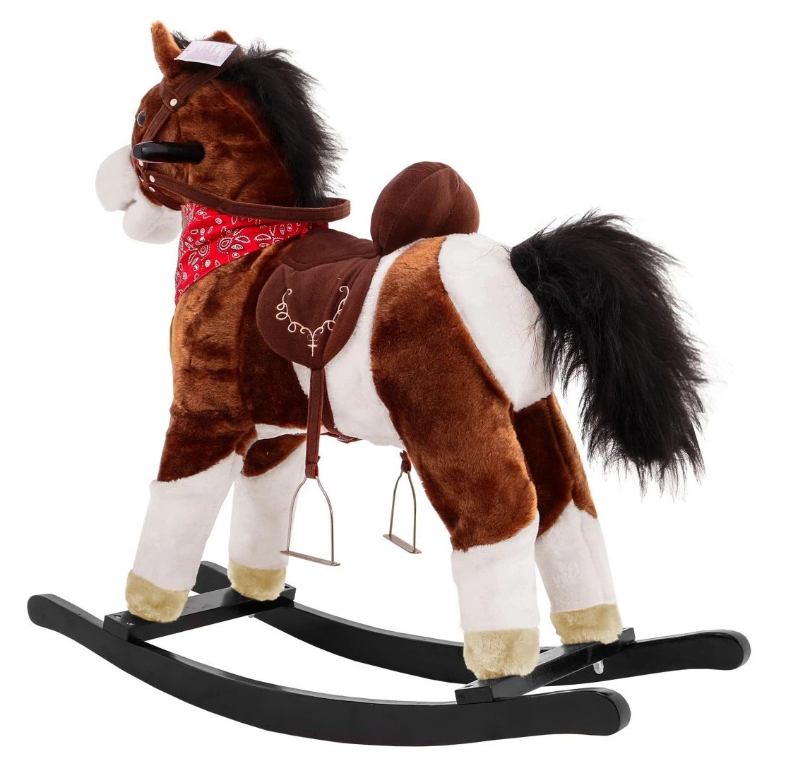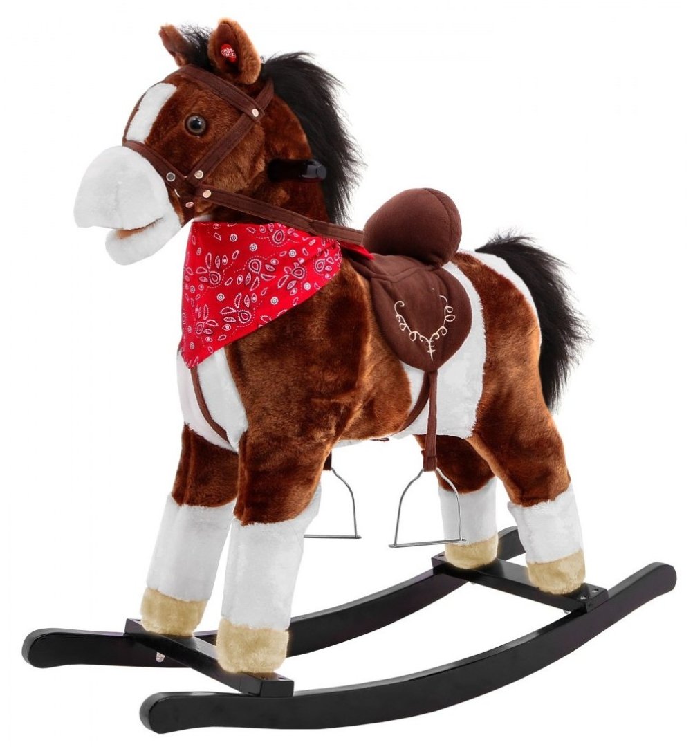 М'який коник-гойдалка — це чудово виготовлена іграшка, яка підходить для дітей від 3 років. Коник виготовлений з білого та коричневого плюшу, що робить його ідеальним для обіймів. Крім того, він має розкішну чорну гриву та червоний шарф на шиї, що надає йому вестернового характеру. Гойдалка має стійку та міцну конструкцію з опорами, які виготовлені з дерева. 2 дерев'яні ручки на голові коня та віжки також допоможуть утримувати рівновагу. Дитині буде зручно сидіти у литому сідлі з вишивкою та стременами.
